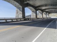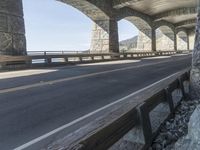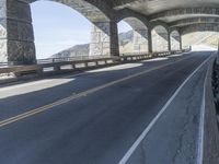 A view of Big Sur from Armco barrier on the Pacific Coast Highway in California, USA, shows a blue sky, clear water, mountains, and a bridge with a yellow guard rail.