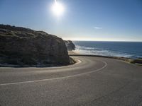 A winding road leads along the coastal terrain of Portugal, with a clear sky and azure ocean in the background. Sunlight and vegetation from the woodlands and grasslands of the highland create a sunny day of exploration.