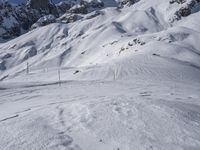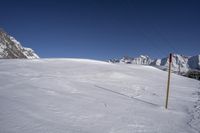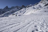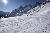 A tourist looks out over the mountains of the French Alps, standing in awe of all the natural landforms, such as the moraine, glacier, and piste. With an open space, clear sky, and the sun shining, it is the perfect spot for skiing, recreation, and tourism in the winter and summer months.