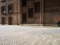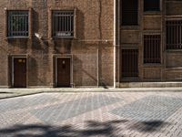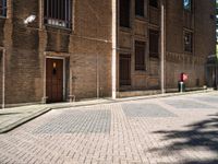 A black and white photo of a brick wall of a warehouse in Holland, Netherlands. Rectangular tints and shades adorn the brickwork and fixtures of the building while a wood paver covers the road surface, door and flooring of the alley-way.