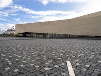 A monochrome shot of a cobblestone road in Lisbon, Portugal, leading to a modern architecture structure with a tree-lined fence in the background. The sky is lit up with the morning sun, showcasing the city's infrastructure and urban design.