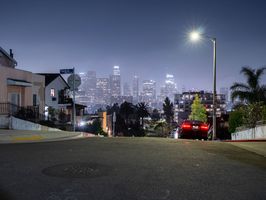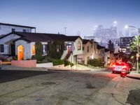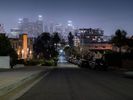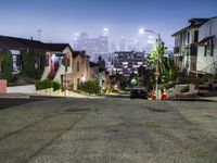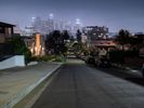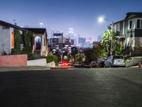 In the suburban residential areas of Los Angeles, the night brings a tranquil cityscape illuminated by artificial lights and street lights. The roads, paved with asphalt, stretch straight down under a clear sky, showcasing the city's unique blend of urban and suburban charm. Open spaces and the quiet hum of city life create a serene yet vibrant atmosphere characteristic of this iconic California locale in the USA.