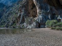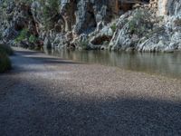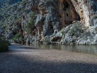 In the heart of Majorca, the Balearic Islands showcase a unique landscape where rock walls and canyons meet open spaces bathed in sunlight. Shadows play on the dirt and gravel surfaces, creating a contrast that highlights the natural beauty of the European terrain. Walls stand tall, casting hard shadows on the rugged terrain, offering a glimpse into the wild and untamed nature of Spain's countryside.
