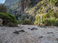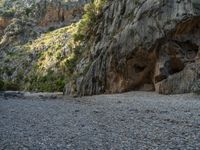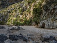 In the heart of Majorca, Balearic Islands, Spain, a rugged landscape unfolds with rocky walls and open spaces. The terrain is a blend of dirt and gravel surfaces, creating a natural canyon-like environment. Walls of stone and rock define the surroundings, offering a glimpse into the untouched beauty of Europe's nature. During the day, the sun illuminates the vast expanse, highlighting the unique textures of the dirt and gravel areas.