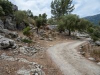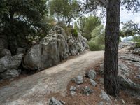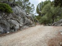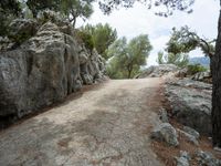 A view of the winding road on the Balearic Island of Mallorca, Spain, surrounded by rock walls, gravel and the natural landscape of the European countryside.