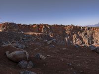 A scenic view of the rugged terrain and mountain landforms of Yunnan, China, with a clear sky overhead, illuminated by the sunlight. A road leads off into the leafy wilderness, winding its way through the brown soil and asphalt, past the rocky walls, igneous rock outcrops, gravel and fault lines, down into the wadi-like canyon and up to the elevated hilltops.