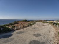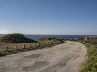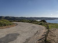 A scenic day at the Portuguese coast, with a view of the azure ocean beyond the Armco barrier and the grassy terrain of the mountain landforms in the foreground.