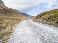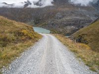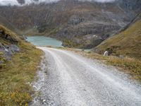 A narrow off-road track leads straight down the road, passing through a rugged landscape of gravel and dirt, dotted with a glimmering lake and framed by the grey sky of an Austrian day. Nature's beauty is on full display, with mountains and open spaces providing a stunning backdrop.