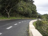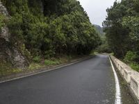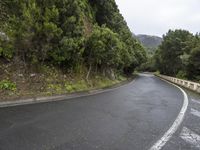 A winding highway through Tenerife's lush landscape, lined with trees and featuring a wet, tar-covered road surface and Armco barrier. This rural road stretches through Spain in Europe, providing a glimpse of the natural beauty of the region.