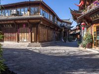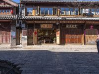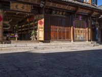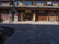 a chinese style store with wooden doors and windows in the sun, with a bricked sidewalk in front