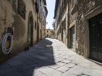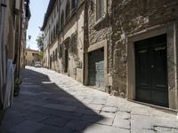 A suburban neighborhood in the Tuscany region of Italy is highlighted in this photo, featuring classic architecture, cobblestone roads and a variety of restaurants, cafes and houses. A bright yellow door stands out against the building facades, while the trees and lane provide a natural landscape and hard shadows.