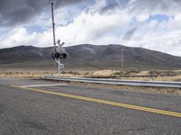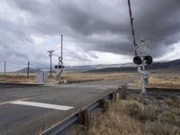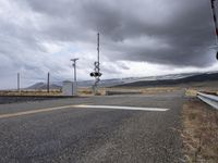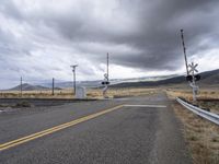 A vehicle travels straight down the highway with a winding road, railway, and Armco barriers cutting through the landscape of Utah's highlands, plains, and rural nature, on a winter day with a grey sky and overhead power lines.