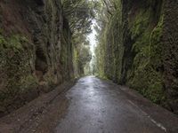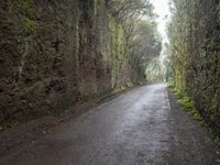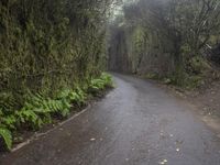 In the natural environment of Tenerife, a road runs straight down the lane, lined with woody plants and trees, and framed with a gloomy grey sky. The wet asphalt and foggy haze create a unique atmosphere that blends the green vegetation and wooded landscape with the infrastructure of the thoroughfare.