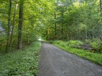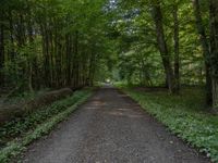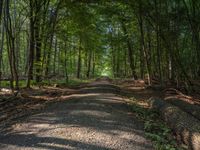 A rural road in Germany winds through lush green forests of Europe, providing a peaceful off-road experience on a gravel and dirt track.