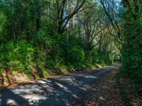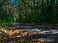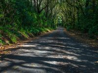 the road is narrow, deep - colored and surrounded by trees, and leafy bushes