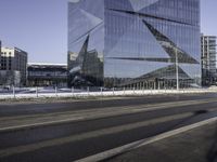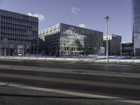 The city skyline at dawn is illuminated by street lights and the glow of window lights from office buildings, residential areas, and condominiums. A thoroughfare of asphalt and freezing road surfaces is lined with a fence and an overhead power line, creating a unique urban design and public space.