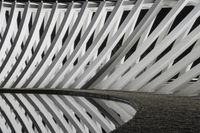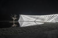 Night view of a modern architectural structure in Suzhou, China, featuring a monochromatic design with white and black elements, illuminated by artificial lights. The straight road, grass surface, and water create a symmetrical pattern, adding to the urban design.