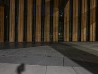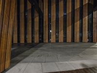 a wooden floor outside a building at night with dark lights on and dark wood paneling
