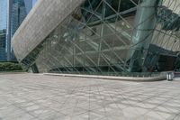 A one-quarter profile of the modern cityscape of Guangzhou, China, featuring glass walls and futuristic architecture against a clear sky. Urban surfaces of concrete and glass pavers create an open, urban space.