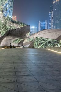 Viewed from straight down the road, the open space of Guangzhou, China is illuminated by artificial light creating a modern and urban cityscape with a museum, music hall and futuristic architecture.