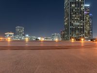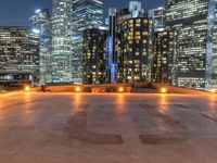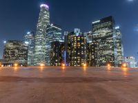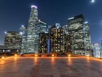 A view of the modern architecture and urban design of the Los Angeles business district at night, with a clear sky, illuminated by artificial light and street lights from an elevated perspective.
