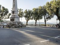 A residential area in Italy's Tuscany region shows its classic architecture, infrastructure, and vegetation in the early morning. With a clear sky, the landscape includes a road, trees, a river, and a memorial obelisk, providing a recreational public space for urban tourists and locals alike.