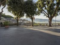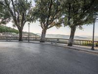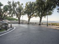 a city road going down the hill with trees on both sides of it and a stone block in the middle of the street