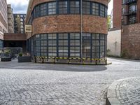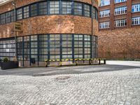 A residential area in Germany is filled with classic brick architecture, cobble stone courtyards, and an urban design of trees, grass, and open spaces. The area is filled with tints and shades of sunlight, creating a composite material of lines, rectangles, and curves. The city life of metropolitan Germany is encapsulated in the view of this neighborhood.