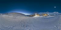 The snow-capped mountains of the French Alps, illuminated by street lights and a clear sky, stand out against the dark night sky during the break of day. The terrain is full of mountainous landforms, ski pistes, and glacial valleys, making it a popular tourist attraction in winter. Tourists trek over the open space, down slopes and tracks, and straight down the road to explore the mountain range's natural beauty.