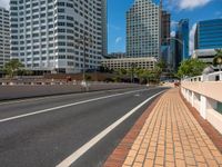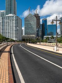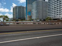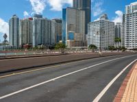 this is a picture of the empty freeway in the city with many skyscrapers in the background