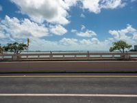 an empty highway in the city with an ocean in the background and blue skies with fluffy clouds
