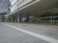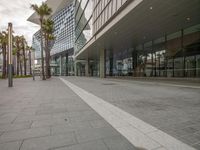 A view of a gloomy metropolitan area at dawn, showing tall office buildings and a road lined with trees and vegetation.