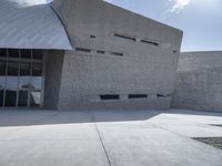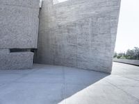 A view of a Brutalist architectural structure in Tenerife, Spain, featuring concrete, marble, granite, and other composite materials. The black and white facade stands out against the clear sky and the beige and grey materials blend in with the surrounding landscape. The memorial is a tourist attraction, located in a residential area of the city.