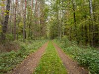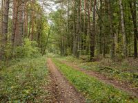 A gravel road winds through a lush, deciduous forest in autumn in Berlin, Germany. The land is covered in terrestrial plants, trees, twigs, evergreens, and shrubs. The dirt and sand floor are illuminated by the cloud-filled sky, creating a picturesque landscape.