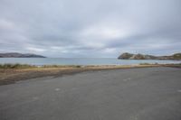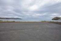 A gloomy grey sky hangs over a coastal landscape with a rocky beach and crashing waves.