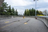 A grey sky looms over a highway in Toronto, Ontario, Canada. The concrete road surface stretches ahead, lined with yellow guard rails and trees. The highway curves gently, leading to an incline with an on-ramp and an exit ramp in the distance.