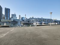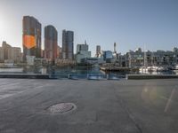 A beautiful sunny morning at the Harbourside Sealed Promenade, with a stunning view of the city skyline and clear blue sky reflecting on the calm river. The modern architecture and high-rise buildings create a perfect urban landscape, while the road surface and street lights enhance the city life. The open space and nature, including the ocean and boat, add a touch of tranquility to this vibrant coastal city scene.