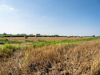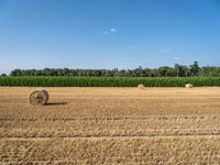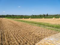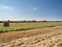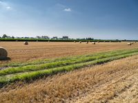A picturesque landscape of lush, green fields and hay bales of straw in Germany on a sunny day. Nature is in full bloom, with a clear sky and open space, making for a rural and peaceful profile.
