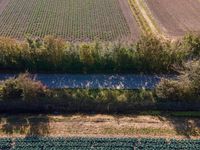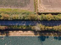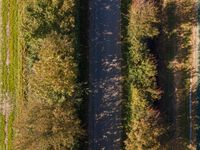A top-down view of the Netherlands shows a rural landscape of asphalt roads, woodlands, and grass fields, with a lake of azure water surrounded by lush vegetation and a clear sky that tints and shades the land. Infrastructure, natural environment, and land lot properties are visible, with some incidental people in the thoroughfare and grass surface.