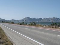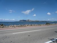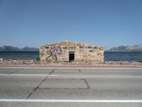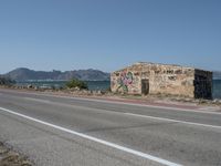 Aerial view of the Balearic Islands, Spain, showcasing a straight road surrounded by nature and the coast of the Mediterranean Sea, including a graffiti wall, and clear blue sky with kitesurfers in the distance.