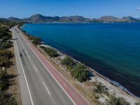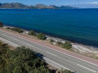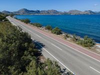 An aerial view of the coastal landscape of Mallorca, an island in the Balearic Islands of Spain in Europe, with a winding asphalt road and clear blue water.