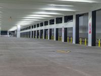 An aerial view of the residential area of Los Angeles, USA, with a parking garage, parking lot, and asphalt roads lit up by artificial light seen from a high and one quarter perspective.