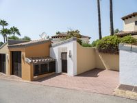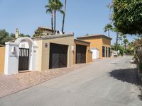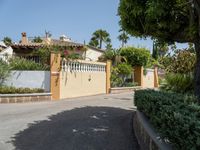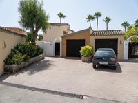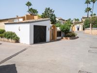An elevated top-down view of the Balearic Islands in Europe reveals an open residential area with an asphalt road, parking garage, and parking lot straight down the road on a clear day.