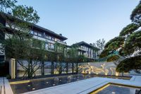 A stunning aerial view of a high-rise residential building in the vibrant city of Chongqing, China, surrounded by nature and a clear sky.