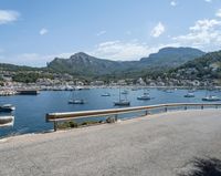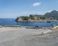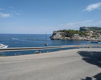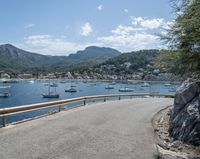 A switchback road curves along a pier, elevated above the harbor near the Balearic Islands in Europe. The Armco barrier provides safety along the asphalt, with views of the clear sky, water, and ocean jetty landing below.