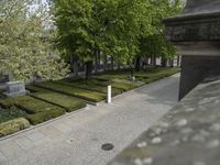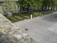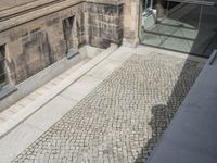 Aerial view of the classic architectural landscape of Berlin, Germany. The cityscape is made up of cobblestone roads, concrete driveways, asphalt walkways, grassy parks, and woody vegetation. The Alte Nationalgalerie is visible in the foreground, with beige house entries and stair-column arches in the alleyways and residential areas.