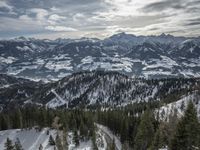 Aerial view of an Armco barrier along a piste in Europe, overlooking Germany and Switzerland's alpine landscape in the winter. The frozen mountain landforms, glacial and forest terrain, and icy lake reflections create a unique and stunning atmosphere in the highland biome.