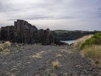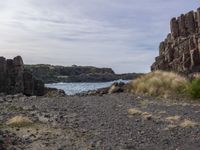 A stunning view of a highland landscape with a coastal watercourse flowing through it. The rugged terrain and bedrock create a dramatic backdrop for the open space and vegetation. The clouds in the sky add depth to the scene on a sunny day.