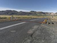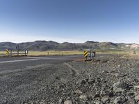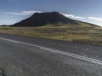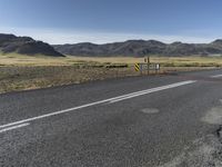 An armco barrier lines a rural road in Iceland, cutting through a landscape of mountains, valleys, grass, and trees as a plane passes overhead with contrails in a clear sky.