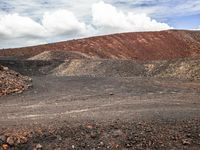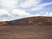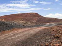 A winding road leading to a mountain range in the highlands is surrounded by a landscape of sand, dirt, gravel, and bedrock. Trees, grass, and open space dot the horizon while tints and shades of brown, gray, and green paint the scene. Cumulus clouds hang above the asphalt and wood road surface, leading to a plateau in the distance.